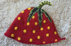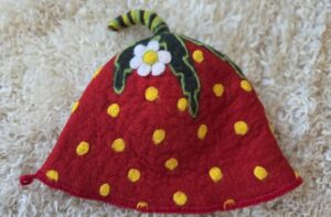Käsitööna valmistatud vilditud saunamüts. Valmistatud Hiiumaa lambavillast. Kasutatud on kuiv- ja märgviltimistehnikat. Riputusaasaga.
