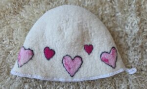 Käsitööna valmistatud vilditud saunamüts. Valmistatud Hiiumaa lambavillast. Kasutatud on kuiv- ja märgviltimistehnikat. Riputusaasaga.